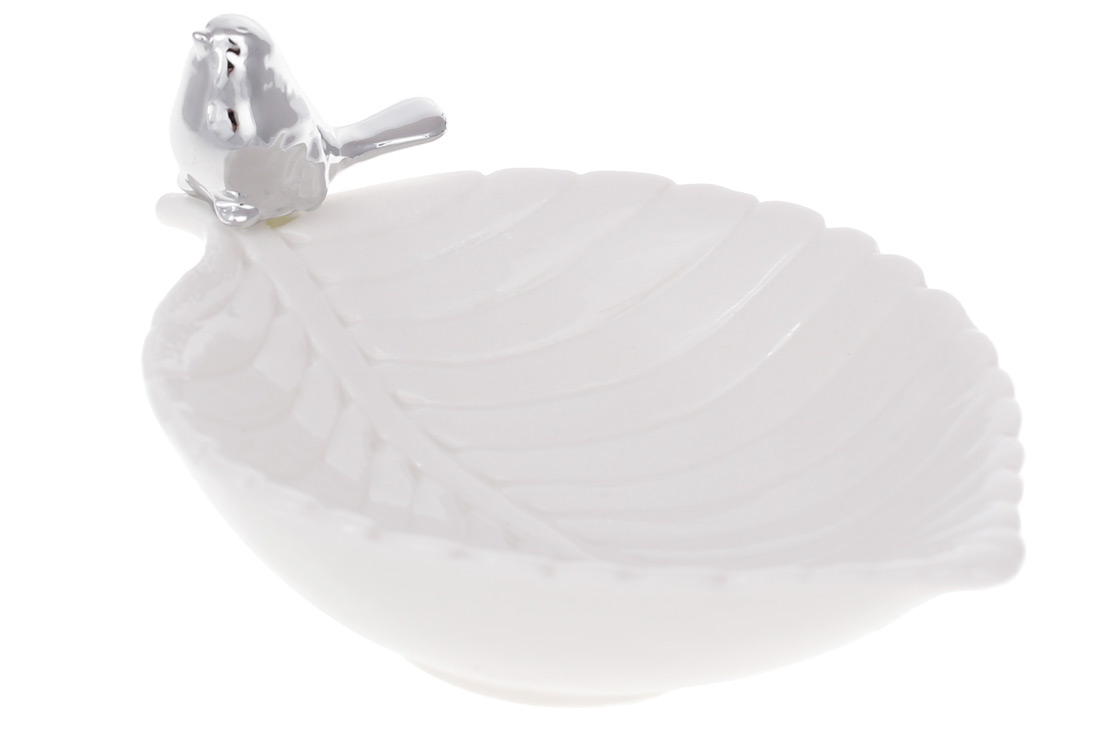 Декоративна підставка для прикрас Лист зі срібною пташкою, 13см