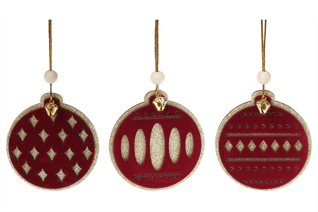Новорічний підвісний декор з бордовим оксамитом, 8,5 см, 3 дизайни