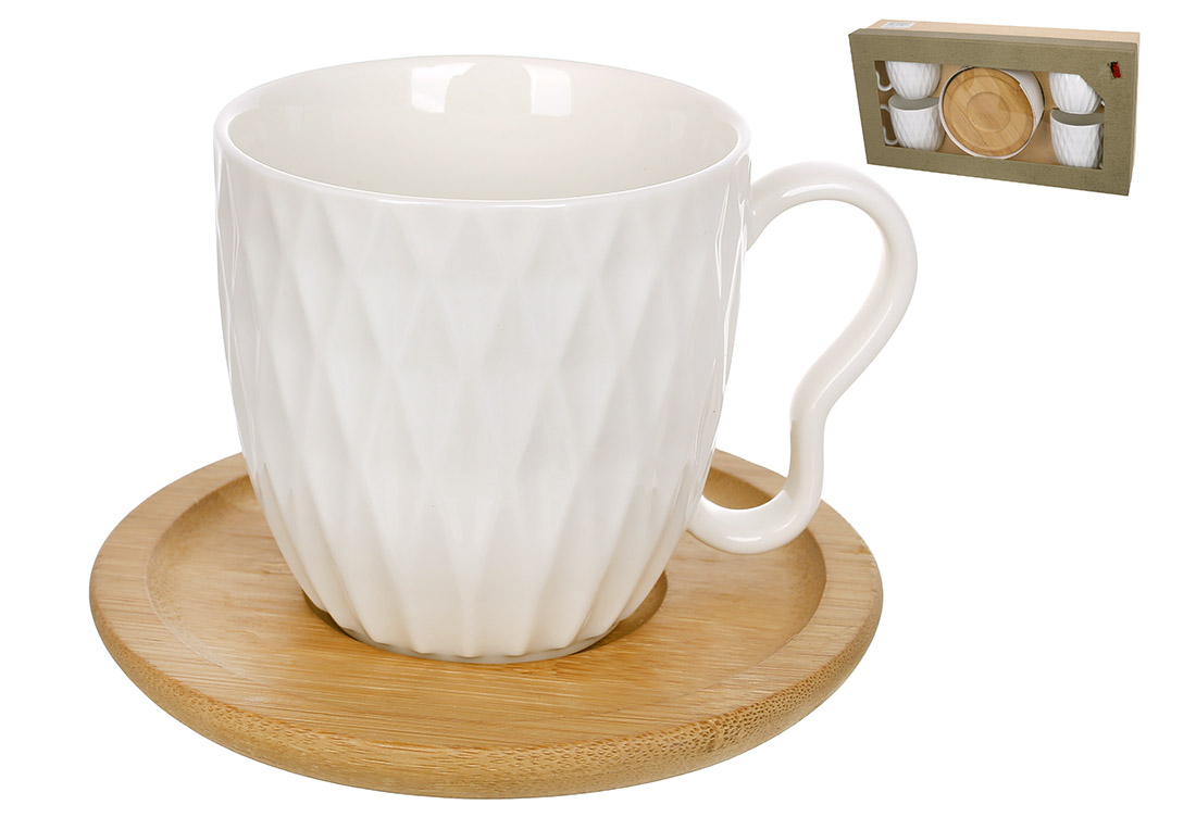 Набір порцелянових чашок з бамбуковими блюдцями (4шт) Romb 200мл /Уцінка - фабричний брак/