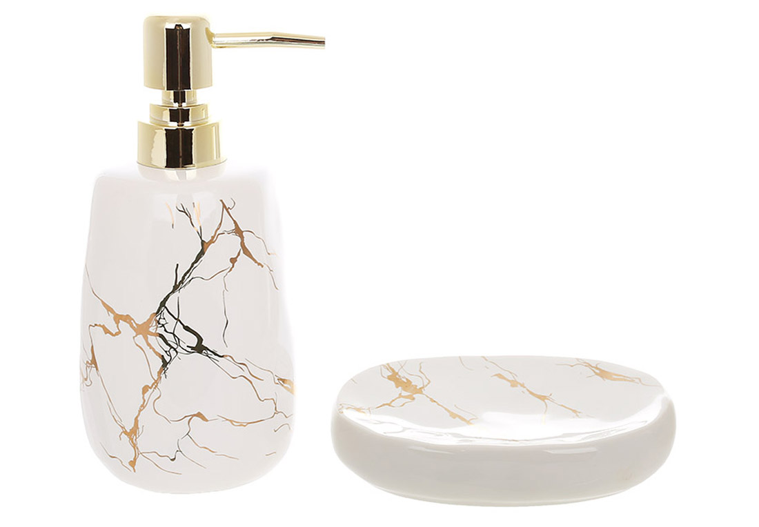 Набір для ванної кімнати (2 предмети) дозатор для мила і мильниця, дизайн - білий мармур із золотом Уцінка - фабричний брак