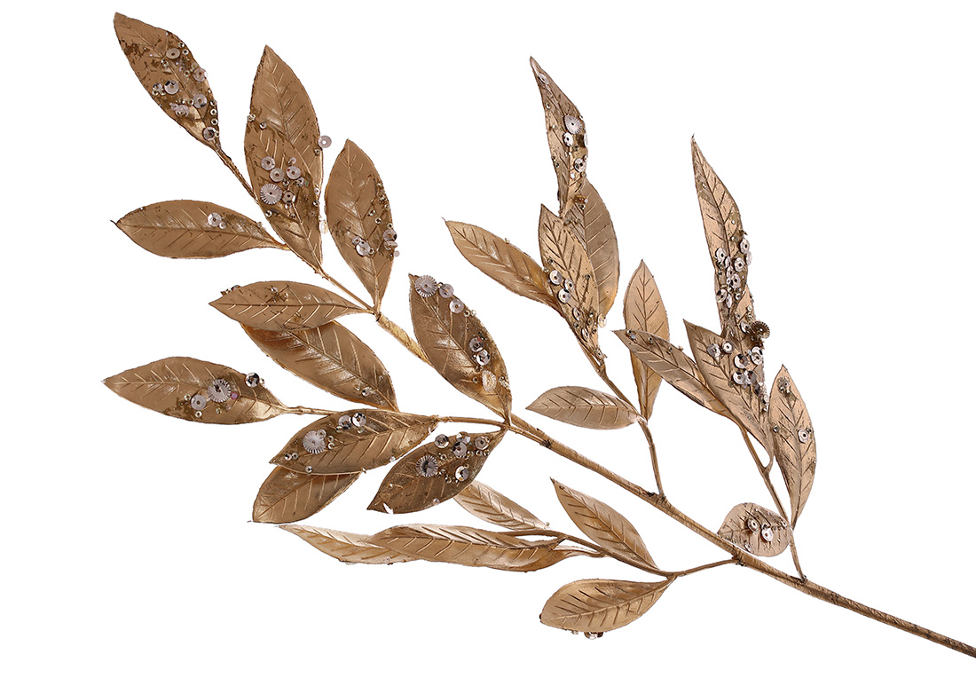 Декоративна гілка листя з великими паєтками, 75см, колір - матове золото.