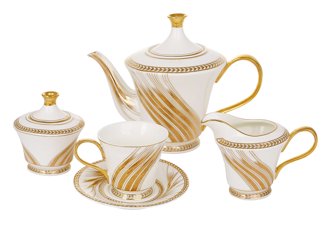 Порцеляновий набір: 6 чашок + 6 блюдець + молочник + цукорниця + чайник / Уцінка - потерте золото / RM9-823