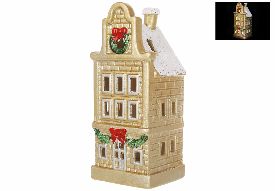 Керамічний Дім з LED підсвіткою та білою присипкою, 7.5*6.7*18см, колір - золото матове 123-012