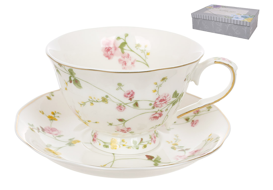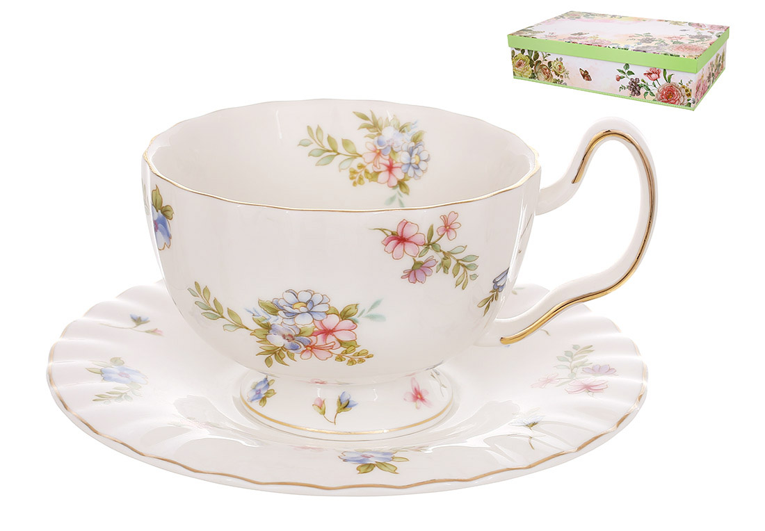 Чайний фарфоровий набір Вінтаж Флорал: 4 чашки 200мл, 4 блюдця, колір - білий з квітковим дизайном і золотою облямівкою