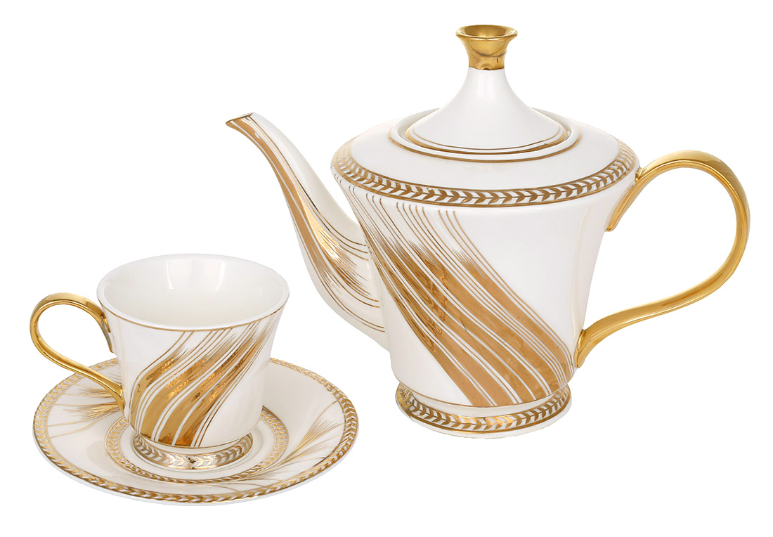 Порцеляновий набір: 4 чашки + 4 блюдця + чайник /Уцінка - потерте золото /