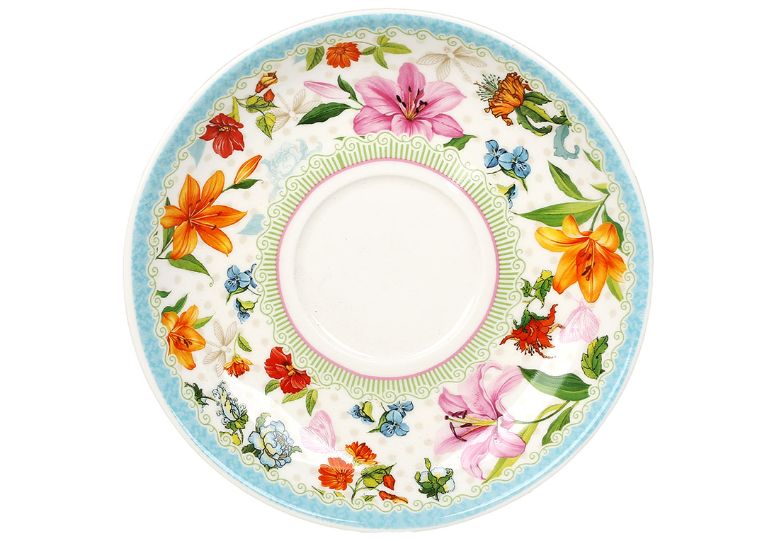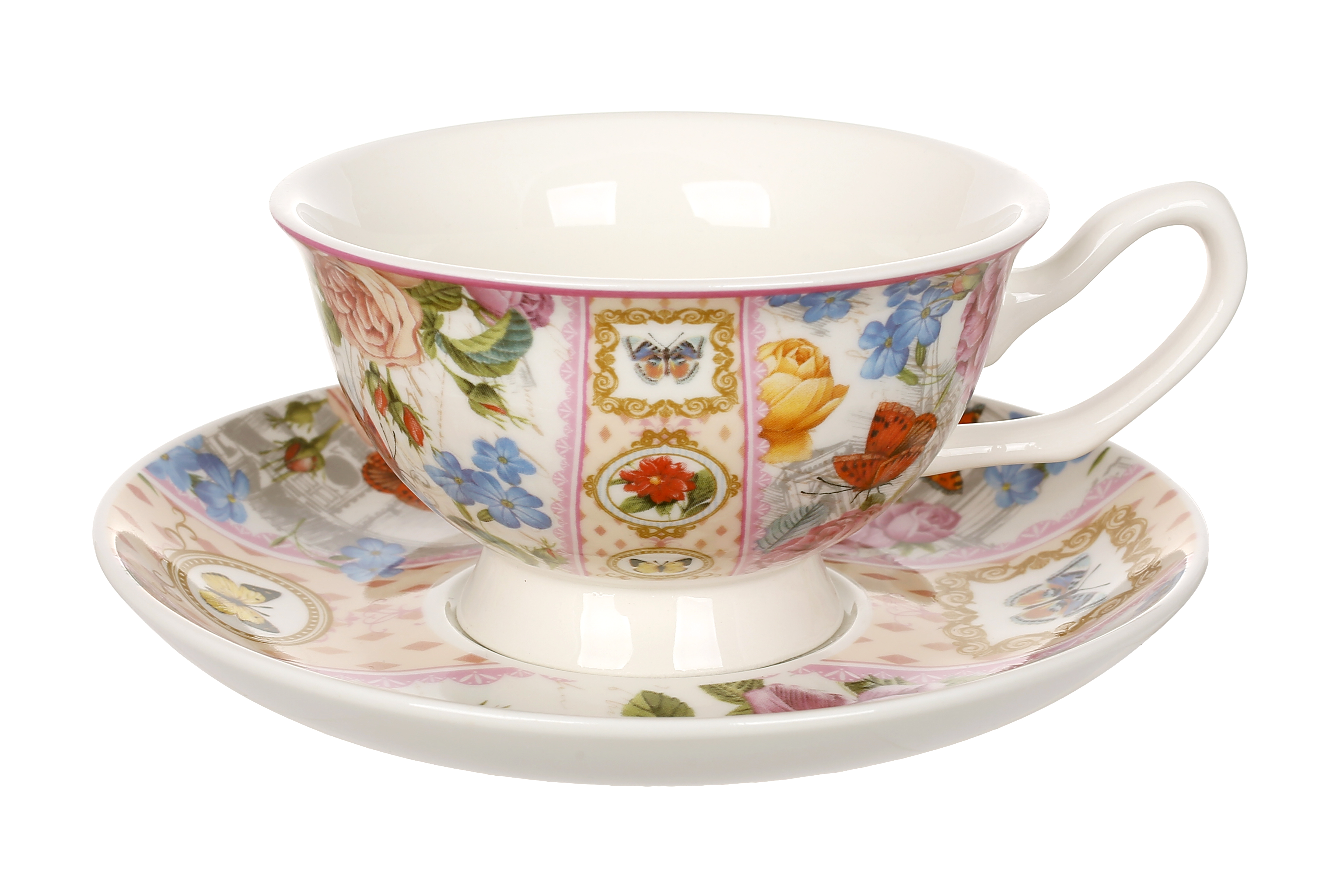 Чайний фарфоровий набір Вінтаж Флорал: 4 чашки 200мл, 4 блюдця, колір - білий з квітковим дизайном і золотою облямівкою