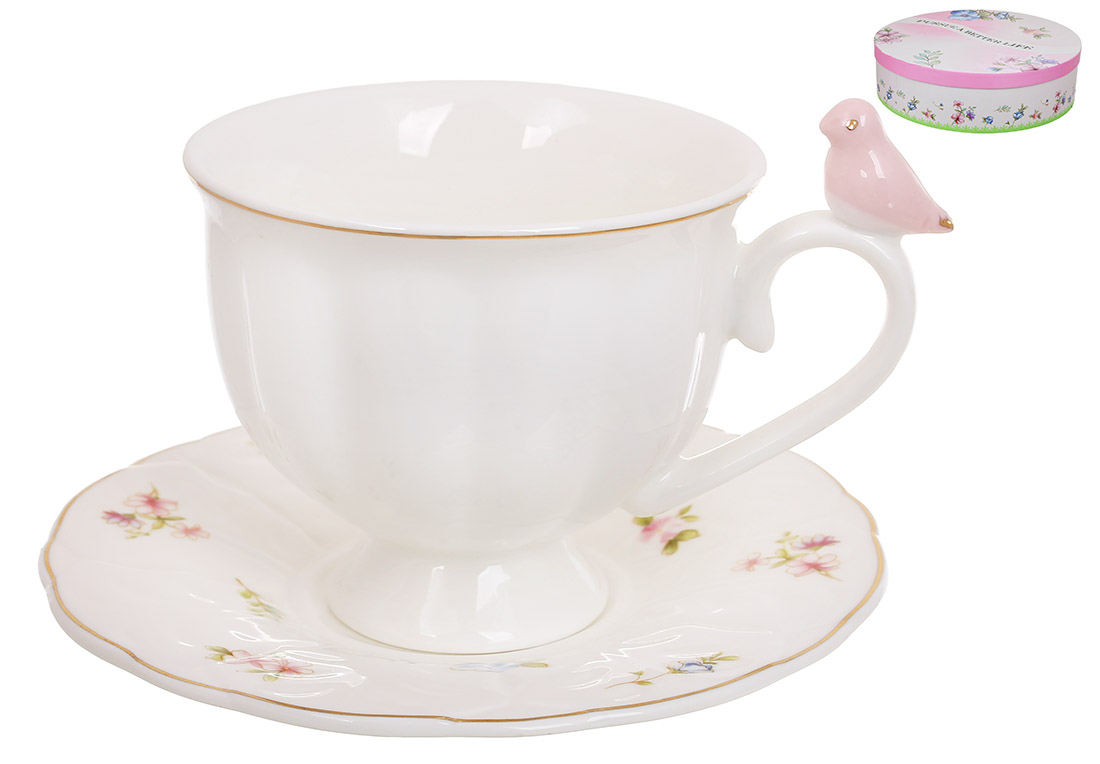 Чайний фарфоровий набір Пташка Флорал: 5 чашок 250мл, 5 блюдець, колір - білий з рожевим та золотим обідком Незначний брак