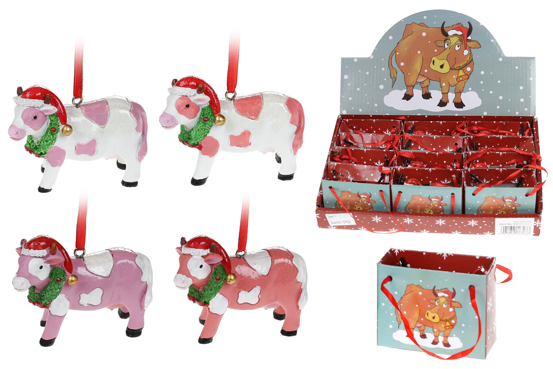 Декоративная подвесная фигурка Новогодняя Коровка, 7см, 4 дизайна, цвет - розовый, персик с белым
